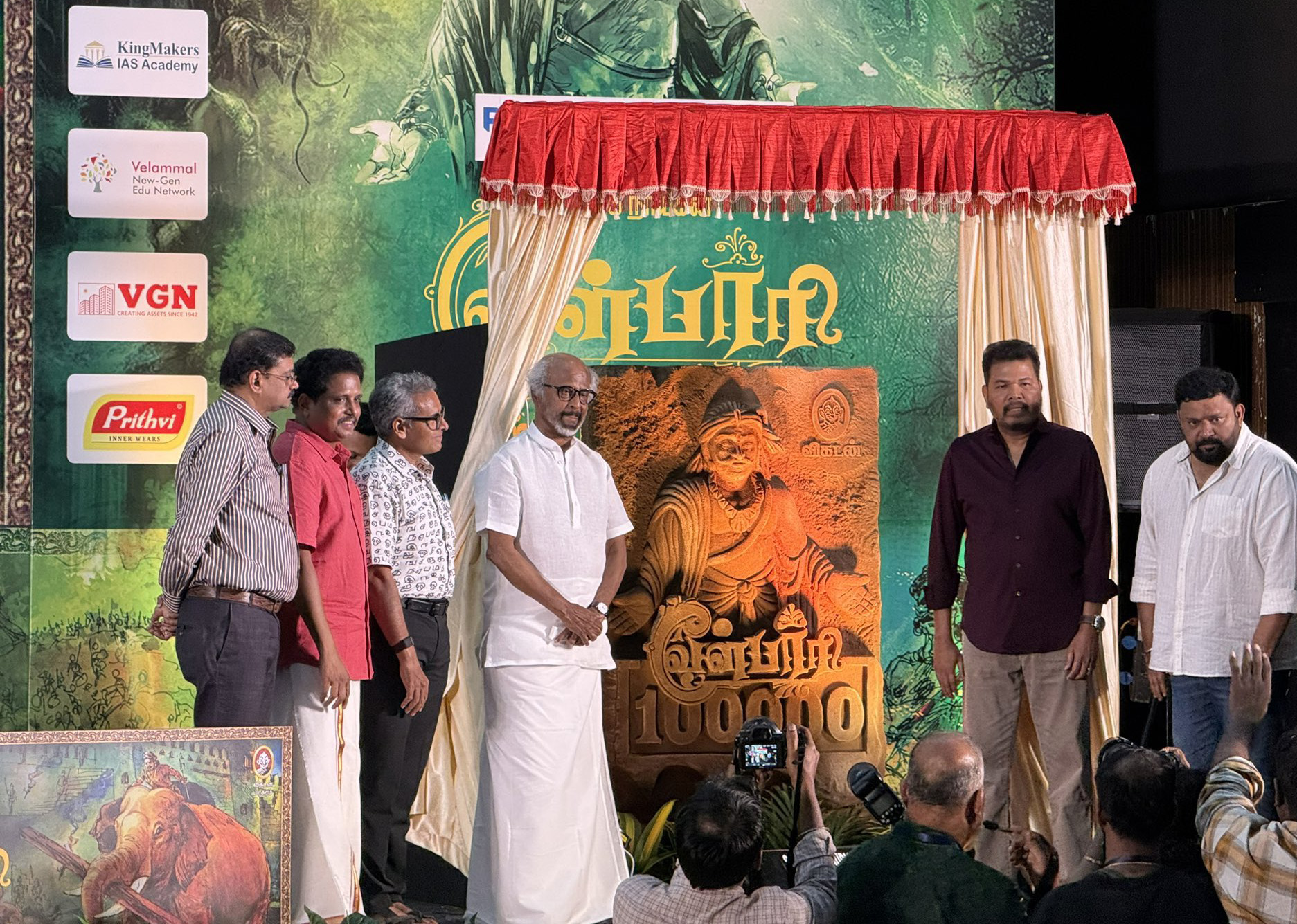சாகித்ய அகாடெமி விருது பெற்ற எழுத்தாளரும், மார்க்சிஸ்ட் கம்யூனிஸ்ட் எம்.பி-யுமான சு. வெங்கடேசன் எழுத்து மற்றும் ஓவியர் மணியம் செல்வன் ஓவியத்துடன் விகடன் பிரசுரத்தில் வெளியாகி `வீரயுக நாயகன் வேள்பாரி’ நாவல், விற்பனையில் ஒரு லட்சம் பிரதிகளைக் கடந்ததை முன்னிட்டு, சென்னை கலைவாணர் அரங்கில் நேற்று `வெற்றிப் பெருவிழா’ நடைபெற்றது. வேள்பாரி நாவலின் ஒரு லட்சமாவது பிரதி விற்ற வெற்றி விழா சின்னத்தை நடிகர் ரஜினிகாந்த் திறந்து வைத்தார். இதில் ரஜினிகாந்த் பேசியதாவது: