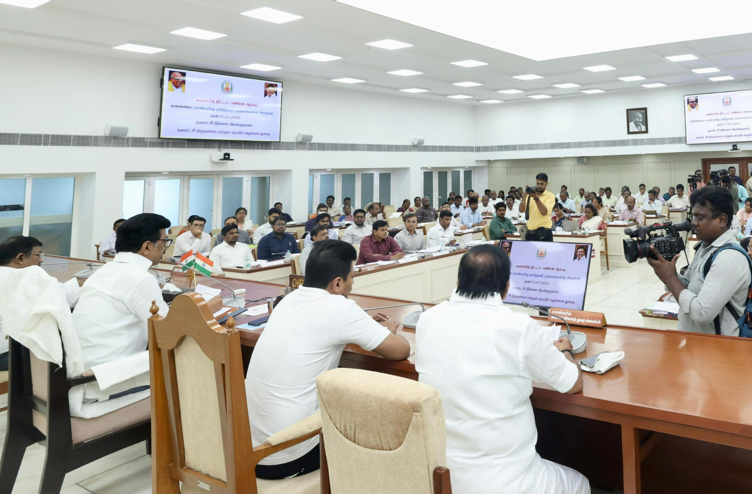 தமிழ்நாடு முதல்வர் மு.க. ஸ்டாலின் தலைமையில் இன்று (ஜூலை 17) தலைமைச் செயலகத்தில், நகராட்சி நிர்வாகம் மற்றும் குடிநீர் வழங்கல் துறை சார்பில் தமிழ்நாட்டிலுள்ள 25 மாநகராட்சிகள் 144 நகராட்சிகளில் மேற்கொள்ளப்பட்டு வரும் அடிப்படை பணிகள் குறித்த ஆய்வுக் கூட்டம் நடைபெற்றது. இந்த கூட்டத்தில், முதல்வர் ஸ்டாலின் தமிழ்நாட்டில் அனைத்து நகர்ப்புற உள்ளாட்சி அமைப்புகளில் மேற்கொள்ளப்பட்டு வரும் பல்வேறு உள்கட்டமைப்பு உருவாக்கம் மற்றும் பராமரிப்புப் பணிகளை விரைந்து நிறைவேற்றிட அறிவுறுத்தினார். குறிப்பாக, மழைநீர் வடிகால் பணிகள், குடிநீர் மற்றும் பாதாளச் சாக்கடை திட்டப் பணிகள் மற்றும் சாலைப் பணிகள் ஆகியவற்றை விரைந்து முடிப்பதற்கான நடவடிக்கை மேற்கொள்ளப்பட வேண்டும் என்றும் குறிப்பிட்டார்.