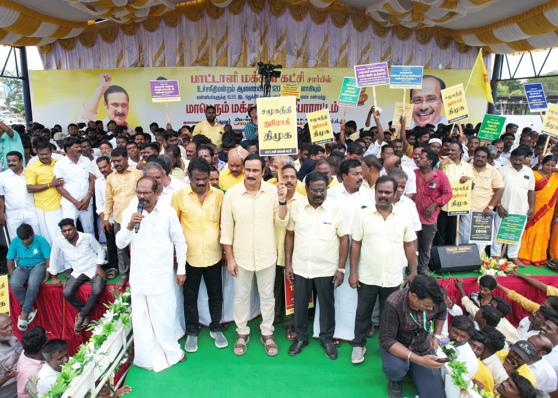 ஸ்டாலின் அரசு வன்னியர்களுக்கு தொடர்ந்து துரோகம் செய்து கொண்டிருக்கிறது. இது முதல் கட்ட ஆர்ப்பாட்டம் அடுத்ததாக சிறை நிரப்புகின்ற போராட்டத்தை நடத்த உள்ளோம்.. அதற்குப் பிறகும் வன்னியர்களுக்கு இட ஒதுக்கீடு கொடுக்கவில்லை என்றால் எங்களுக்கு தெரிந்த ‘அந்த போராட்டம்’ தான்.. அனைவரும் தயாராக இருக்கிறீர்களா? மூன்று ஆண்டுகளாக உங்களுக்கு இட ஒதுக்கீடு கொடுக்கிறோம் கொடுக்கிறோம் என்று திமுக அரசு பொய் சொல்லி ஏமாற்றி வந்தது கடைசி நேரத்தில் இப்போது கொடுக்க முடியாது என்று சொல்கிறார்கள்.