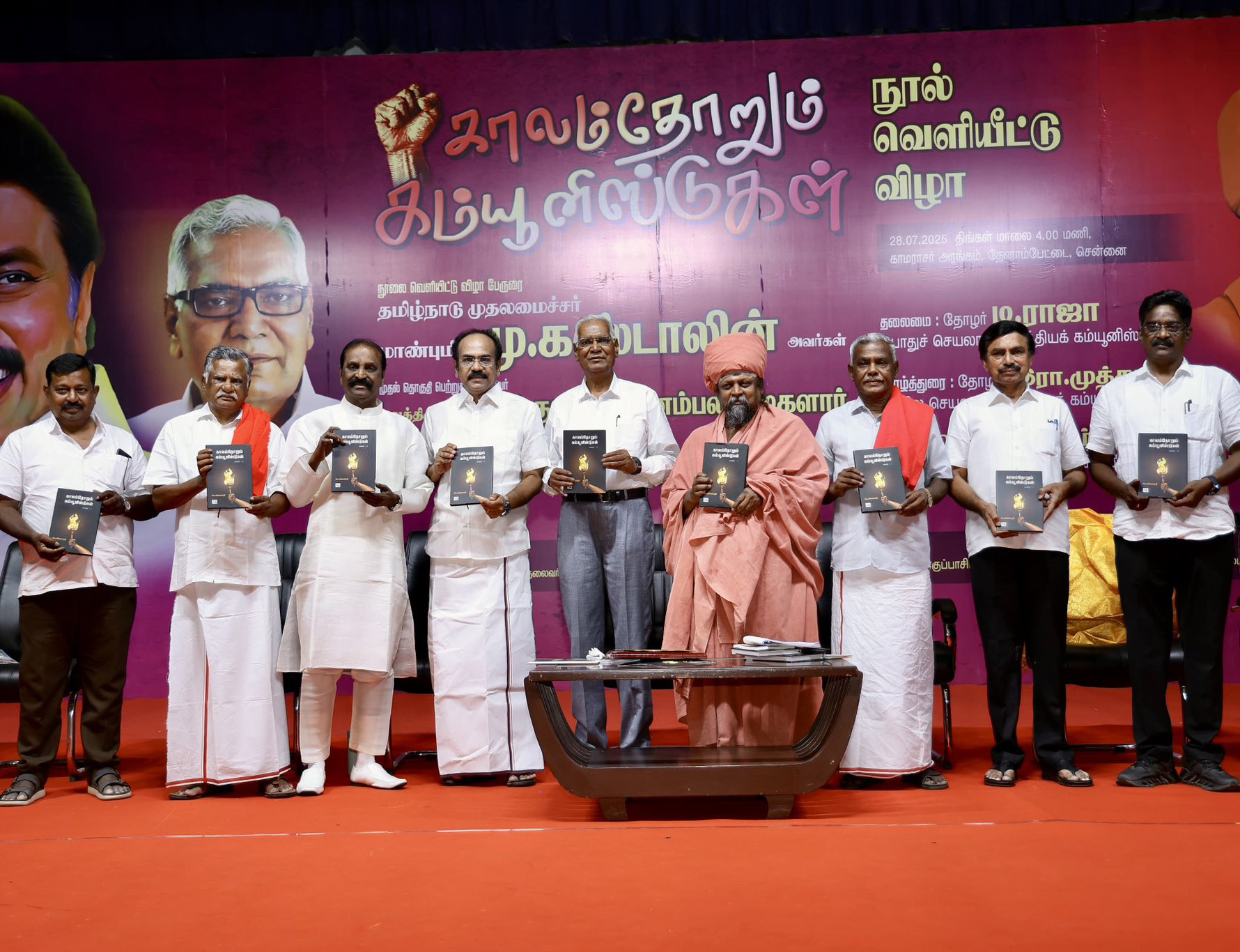 இந்த நிகழ்ச்சியில் இந்திய கம்யூனிஸ்ட் தேசிய செயலாளர் டி.ராஜா, மாநில செயலாளர் முத்தரசன், மார்க்சிஸ்ட் கட்சி மாநில செயலாளர் பெ.சண்முகம், நியூ செஞ்சுரி புத்தக நிறுவன தலைவர் த.ஸ்டாலின் குணசேகரன், மேலாண்மை இயக்குநர் க.சந்தானம் மற்றும் கட்சியினர் கலந்து கொண்டனர்.