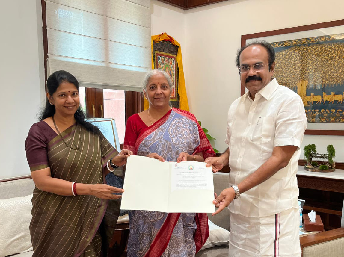 மத்திய நிதி மந்திரி நிர்மலா சீதாராமனை டெல்லியில் தமிழக நிதி அமைச்சர் தங்கம் தென்னரசு மற்றும் திமுக எம்.பி. கனிமொழி நேற்று சந்தித்தனர். இந்த சந்திப்பின்போது, 2025-26ம் ஆண்டு நிதியாண்டில் நபார்டு வங்கியின் ஊரக உட்கட்டமைப்பு மேம்பாட்டு நிதியின் கீழ் ரூ.4,500 கோடிக்கான நிதியையும், மீன்வள உட்கட்டமைப்பு மேம்பாட்டு நிதியின் கீழ் குளச்சல் மீன்பிடித் துறைமுக விரிவாக்கத்திற்கு ரூ. 350 கோடி நிதியையும் விரைந்து வழங்கிட ஒப்புதல் அளிக்குமாறு முதல்-அமைச்சர் மு.க.ஸ்டாலின் எழுதிய கடிதத்தை மத்திய நிதி மந்திரி நிர்மலா சீதாராமனிடம் தமிழக நிதி அமைச்சர் தங்கம் தென்னரசு வழங்கினார்.